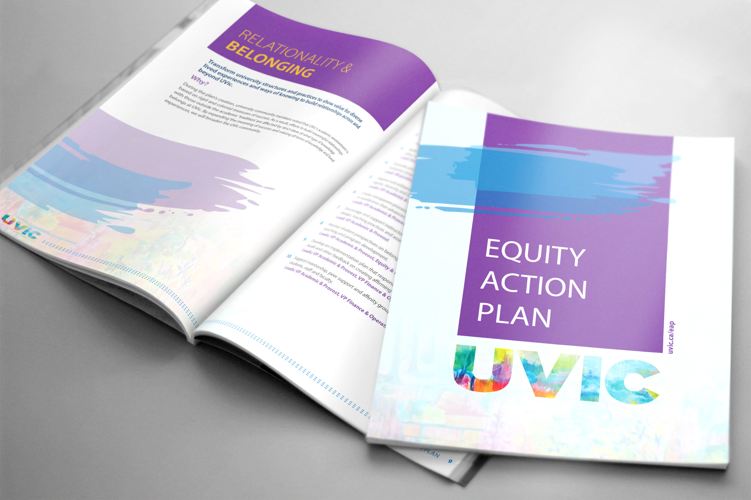 This document design for the University of Victoria’s Equity Action Plan was intended to be clean, modern, and visually expressive, using bold colour fields, artistic textures, and structured typography to communicate clarity and importance while maintaining an engaging, approachable feel.